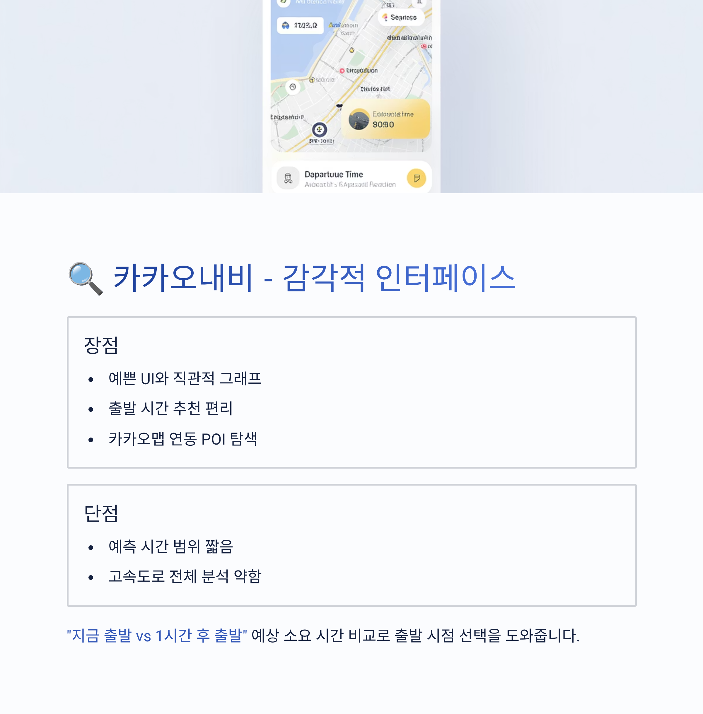 | 빠르게 출발 시간만 알고 싶을 때 | ✅ 카카오내비 (시간대별 제안 기능) |