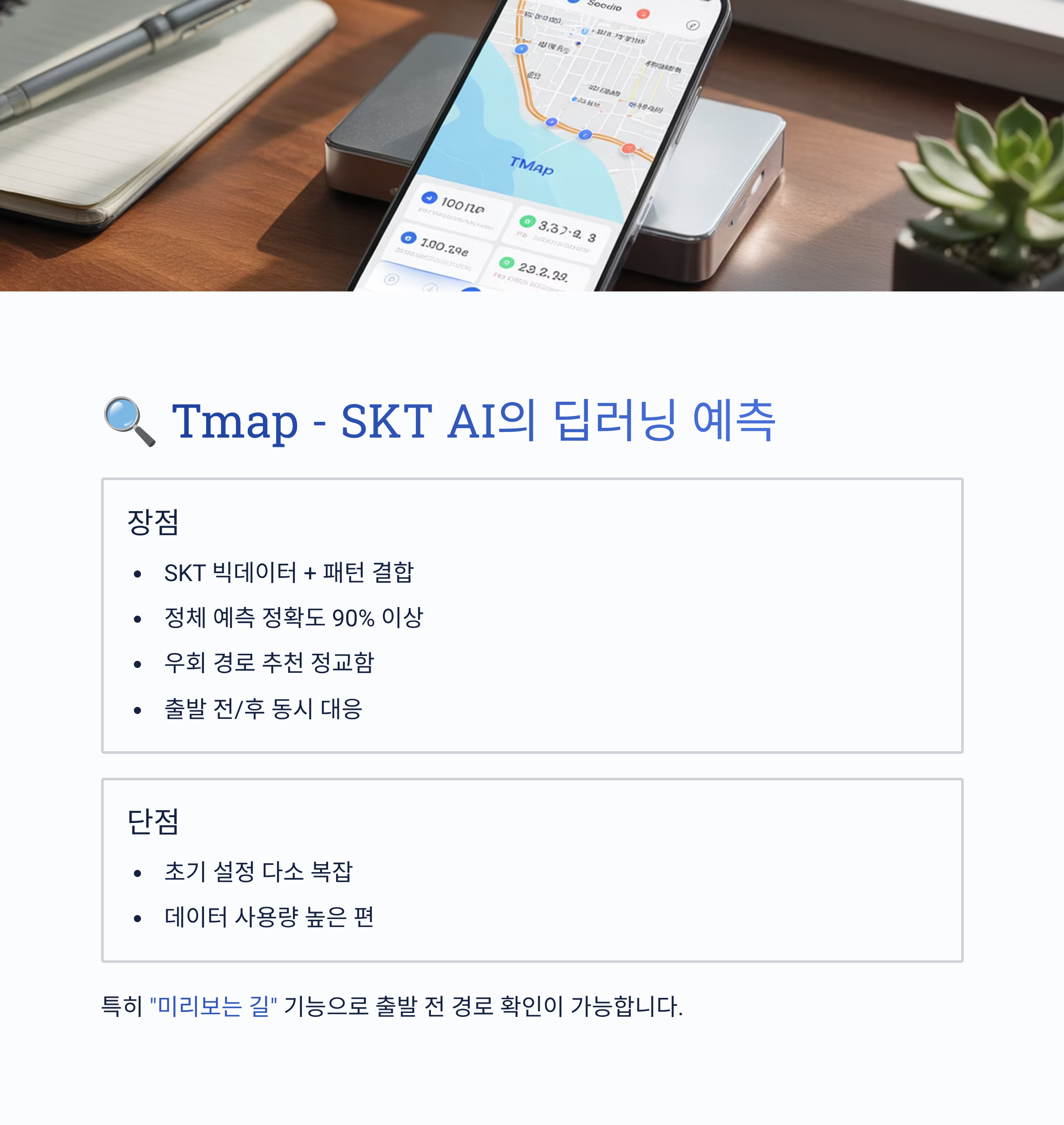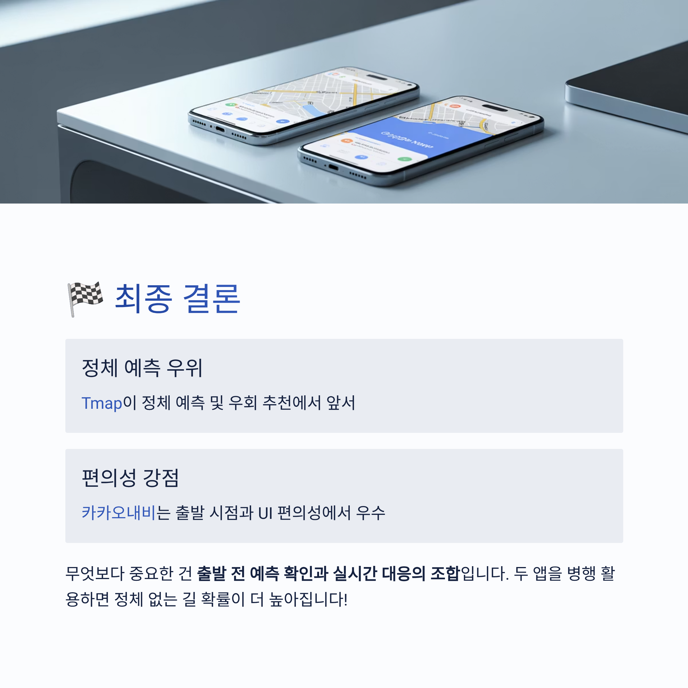 결론: Tmap은 정체를 미리 피할 수 있는 경로를 AI가 먼저 제안해줘 실제 도착 시간이 거의 정확합니다.