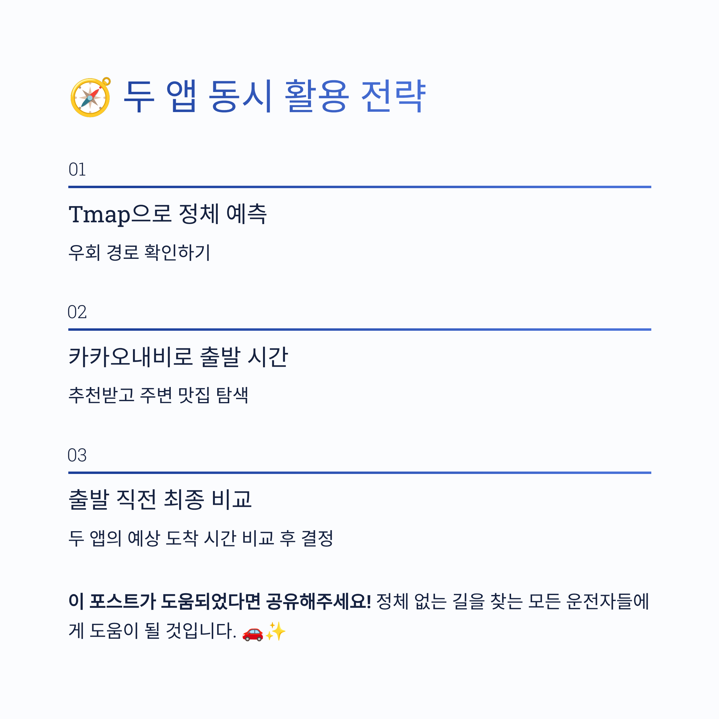 | 장거리 고속도로 주행 | ✅ Tmap (정체 예측 정확도 우수) |