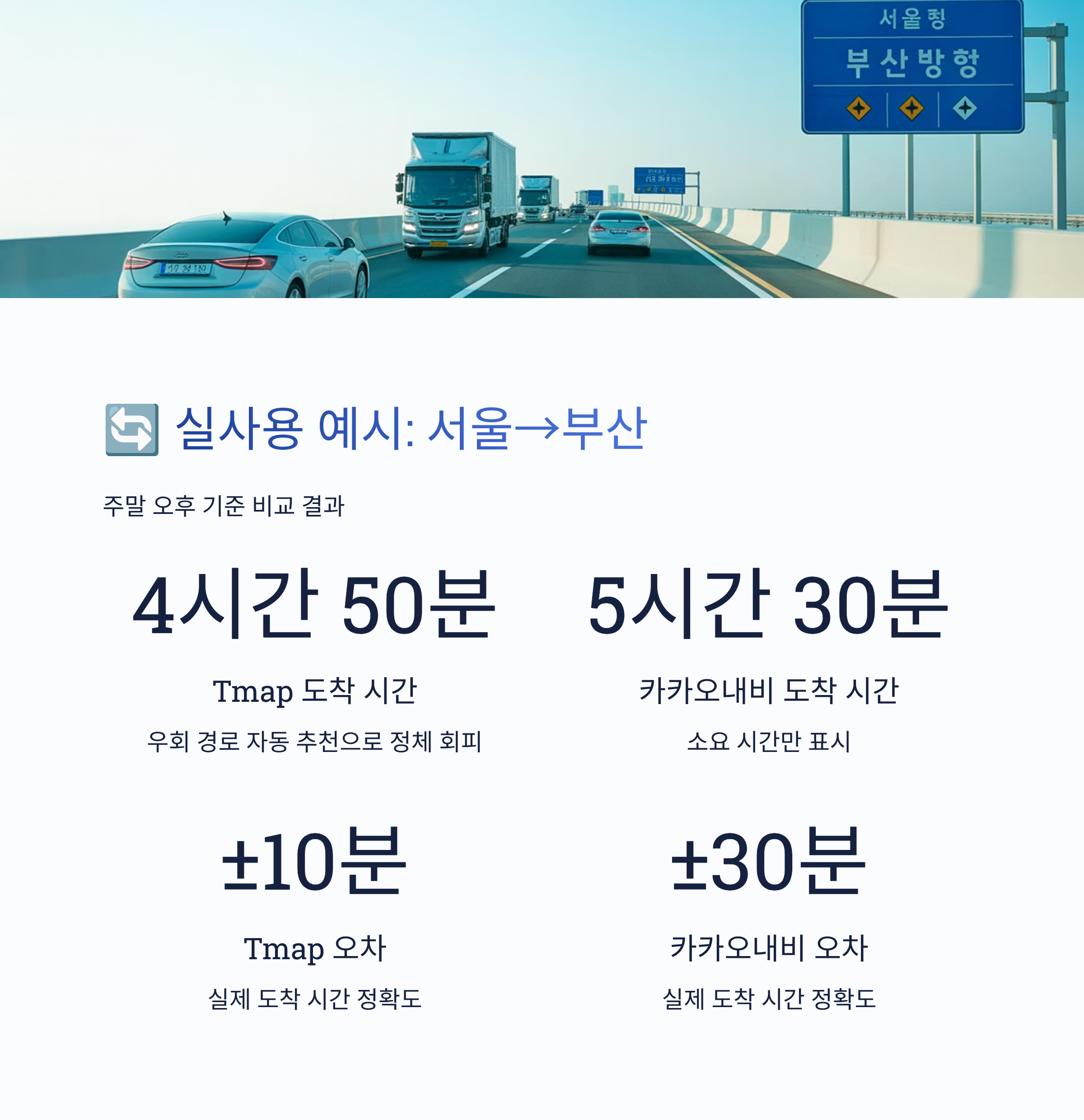 🔄 실사용 예시 비교: 서울 → 부산 (주말 오후 기준)