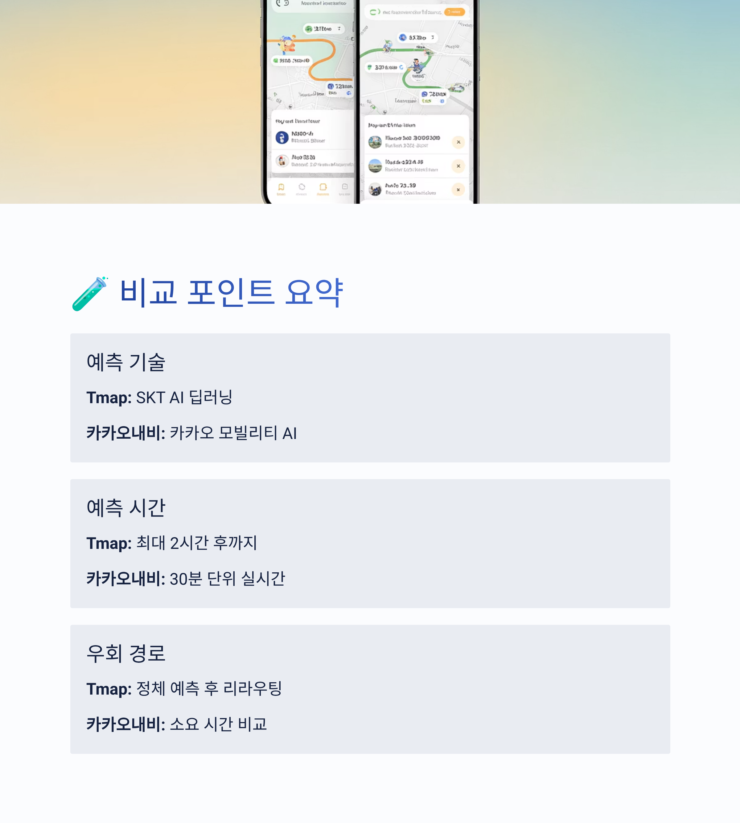 | 예측 기술 | SKT AI 기반 딥러닝 | 카카오 모빌리티 AI 분석 |